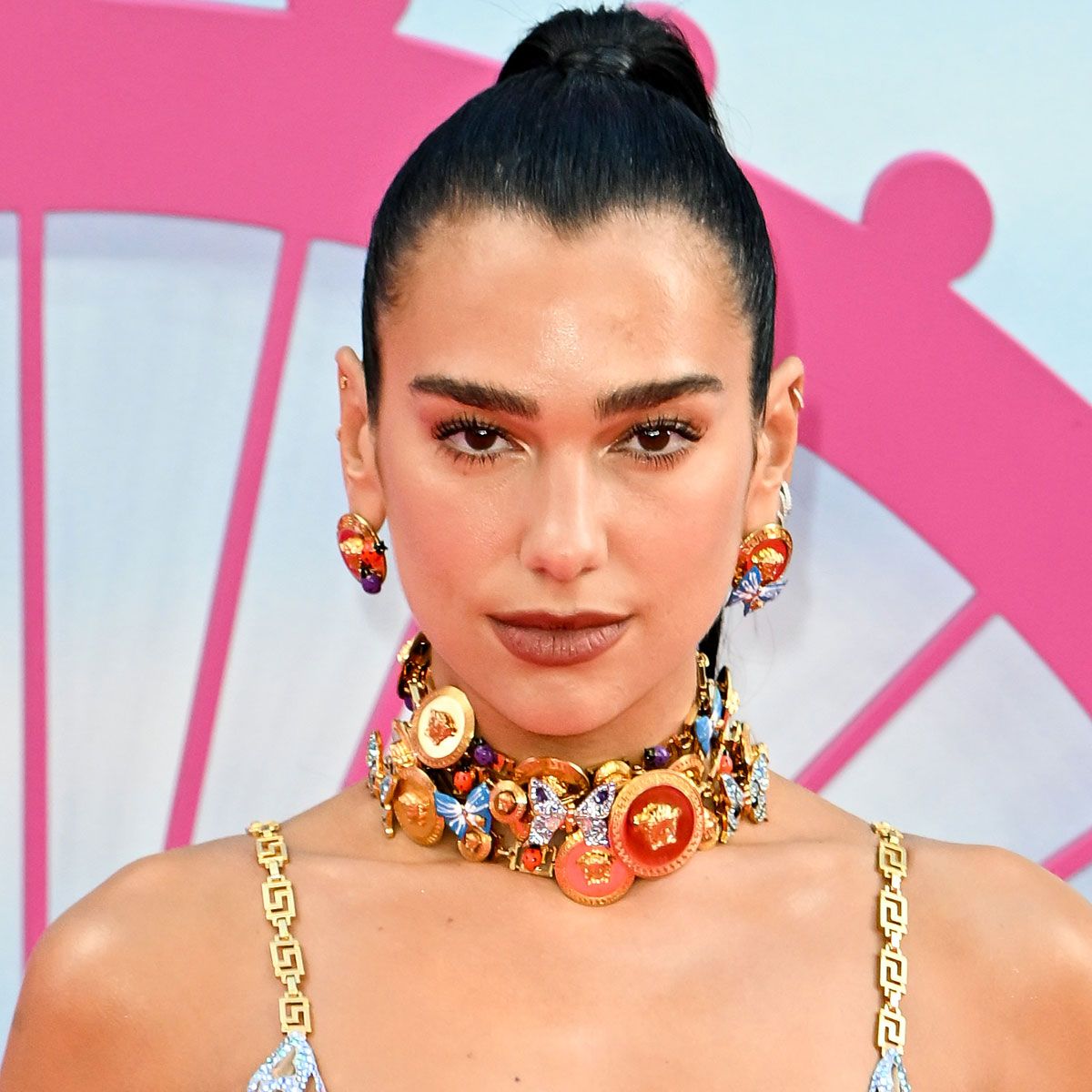 Dua Lipa Slips Into Her Own Versace Collection In A Strappy Floral Dress And Chunky Accessories At London’s ‘Barbie’ Premiere